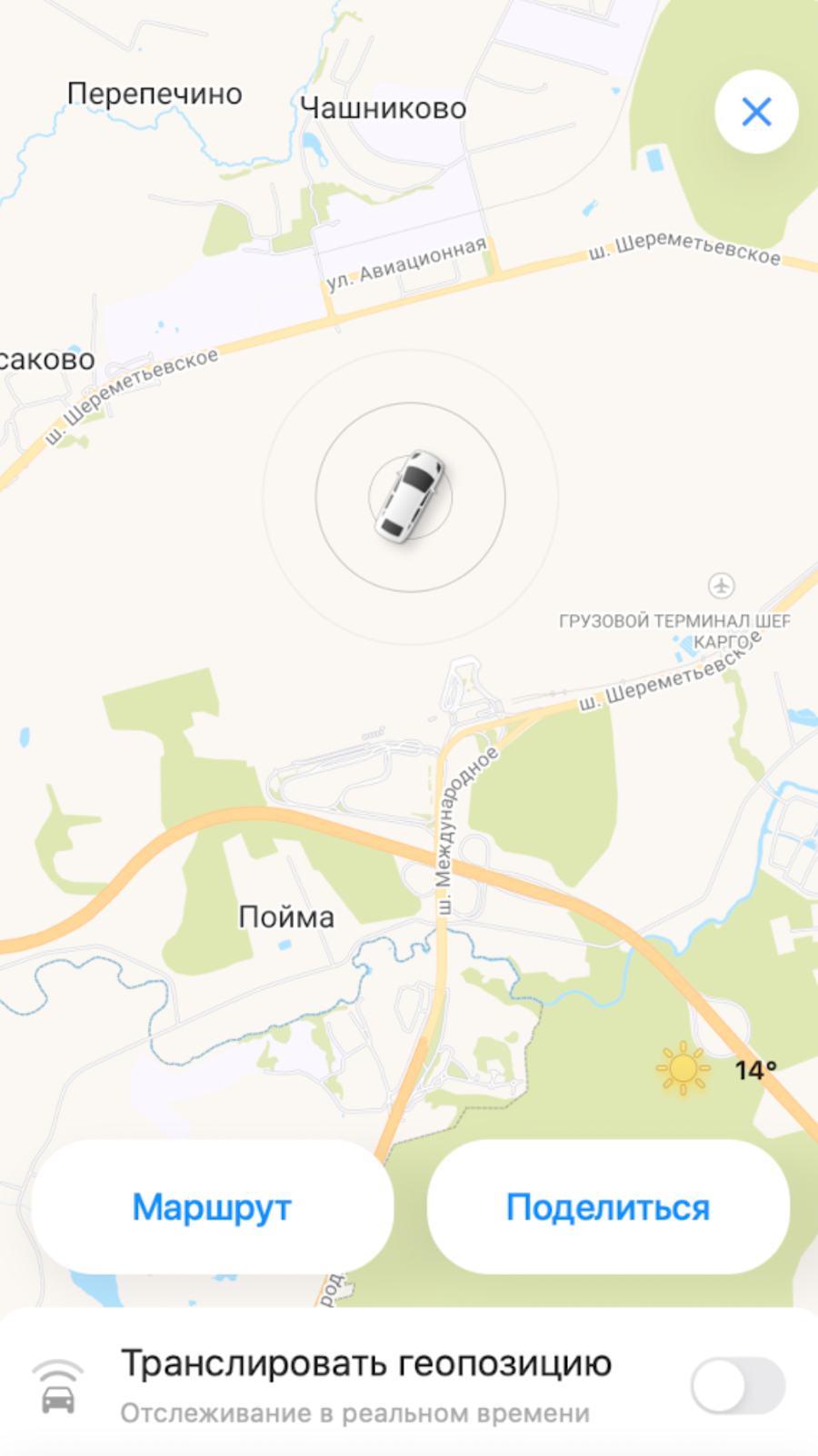В приложении также отображается состояние автомобиля на карте с помощью цветовых кругов и иконки машины: