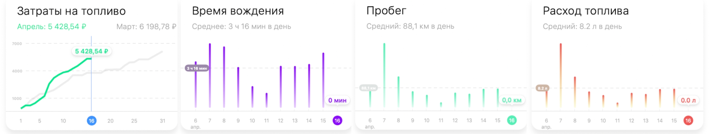 Затраты на топливо, время вождения, пробег, расход топлива