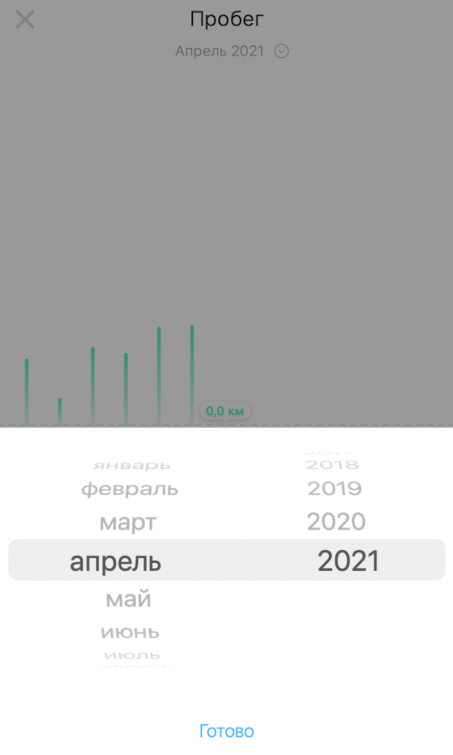 При детальном просмотре в приложении вы можете выбрать месяц, для которого необходимо отобразить статистику. Для этого нажмите на название указанного месяца и в приложении отобразится список месяцев, для которого можно просмотреть статистику по пробегу.