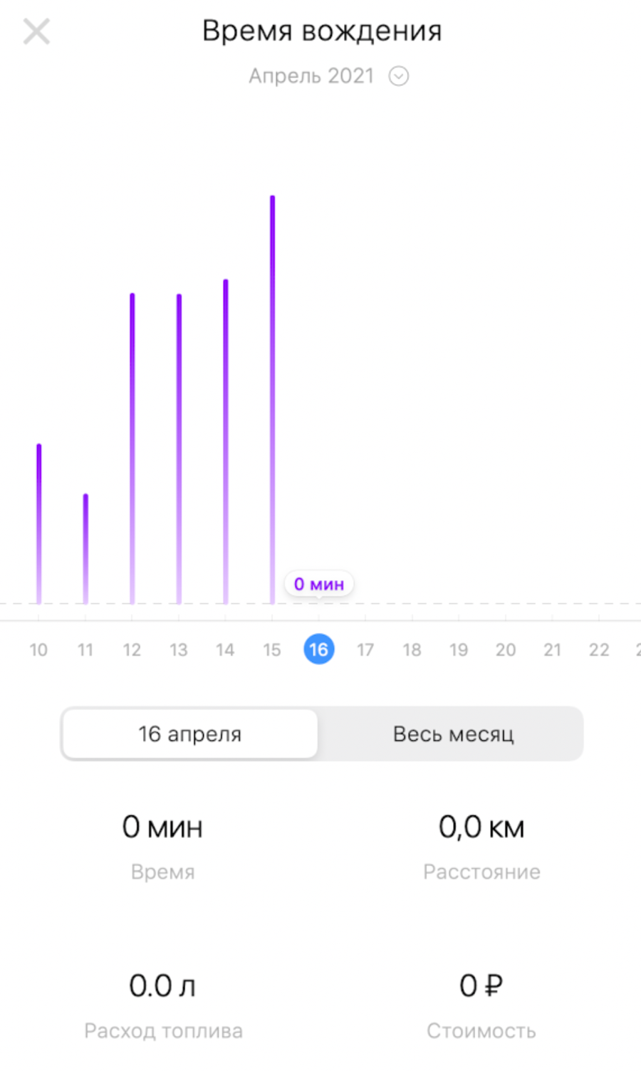 Вы также можете просмотреть информацию (время, расстояние, расход топлива, стоимость) по конкретной дате или данные за весь месяц.
