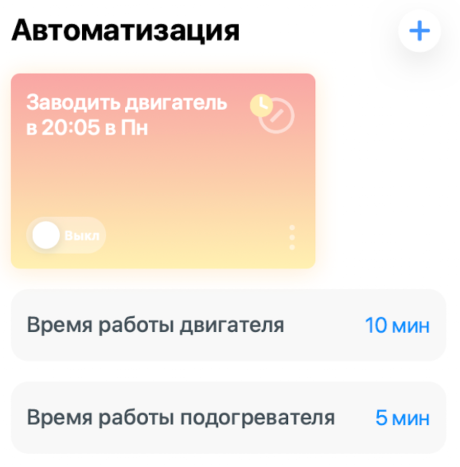 При автоматизированном запуске двигателя или включении прогрева время работы двигателя/прогрева берется из настроек времени работы двигателя/прогрева в блоке "Автоматизация" на экране управления.